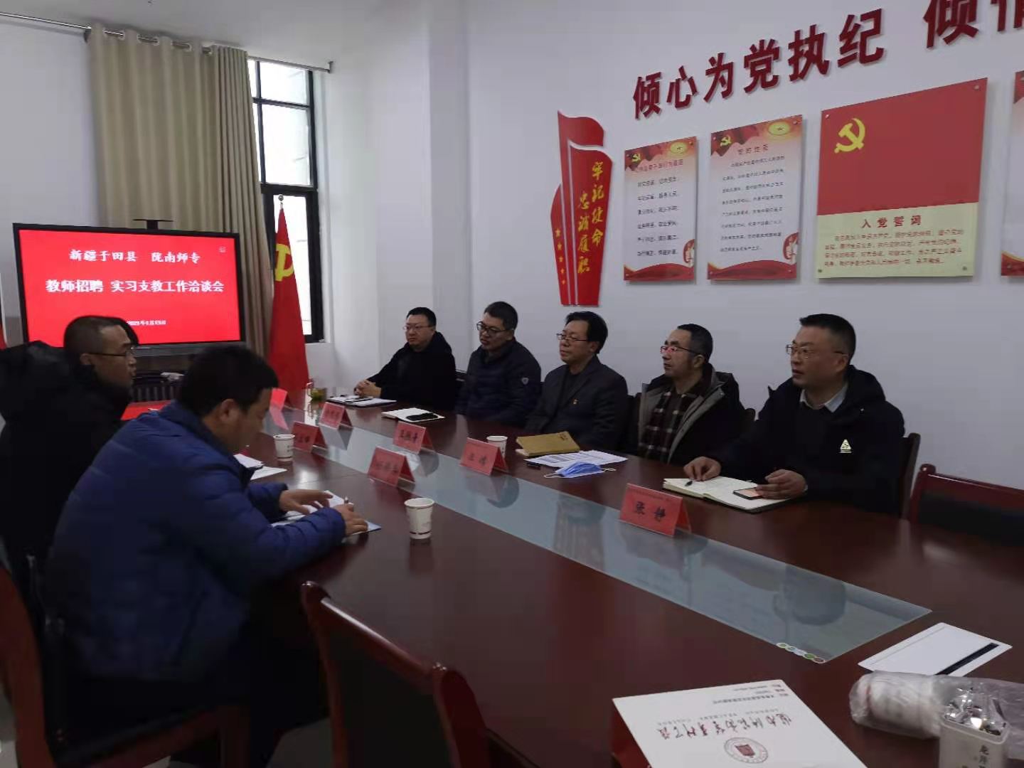 1月13日下午,新疆和田地区于田县教育局副局长石立峰一行三人莅临我校商谈教师招聘和实习支教事宜。我校党委委员、副校长王胜青、招生就业处和教务处负责人参加了座谈会。座谈会由王胜青主持。
