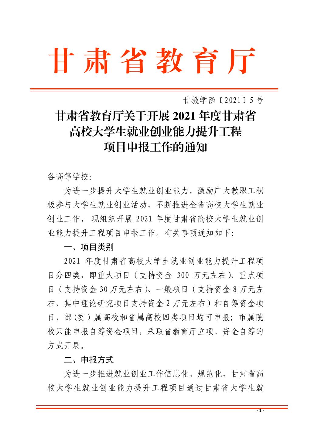 甘肃省教育厅关于开展2021年度甘肃省高校大学生就业创业能力提升工程项目申报工作的通知