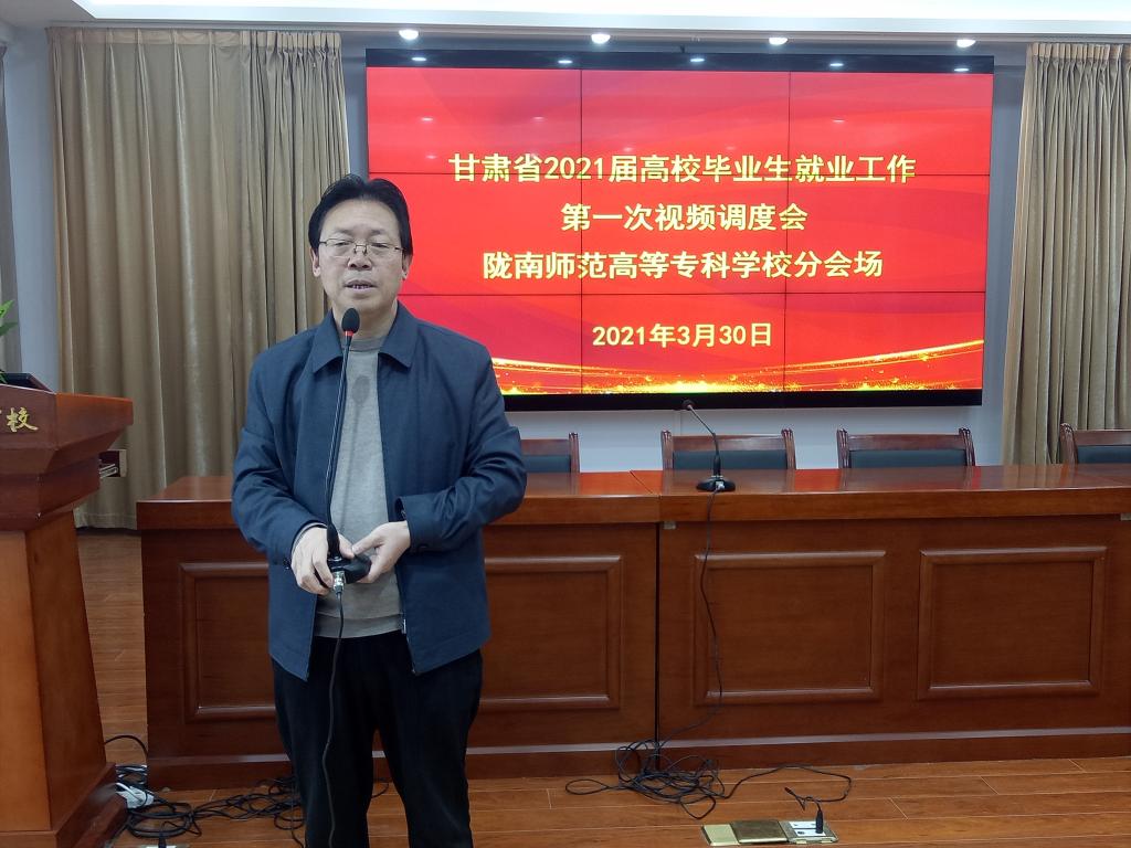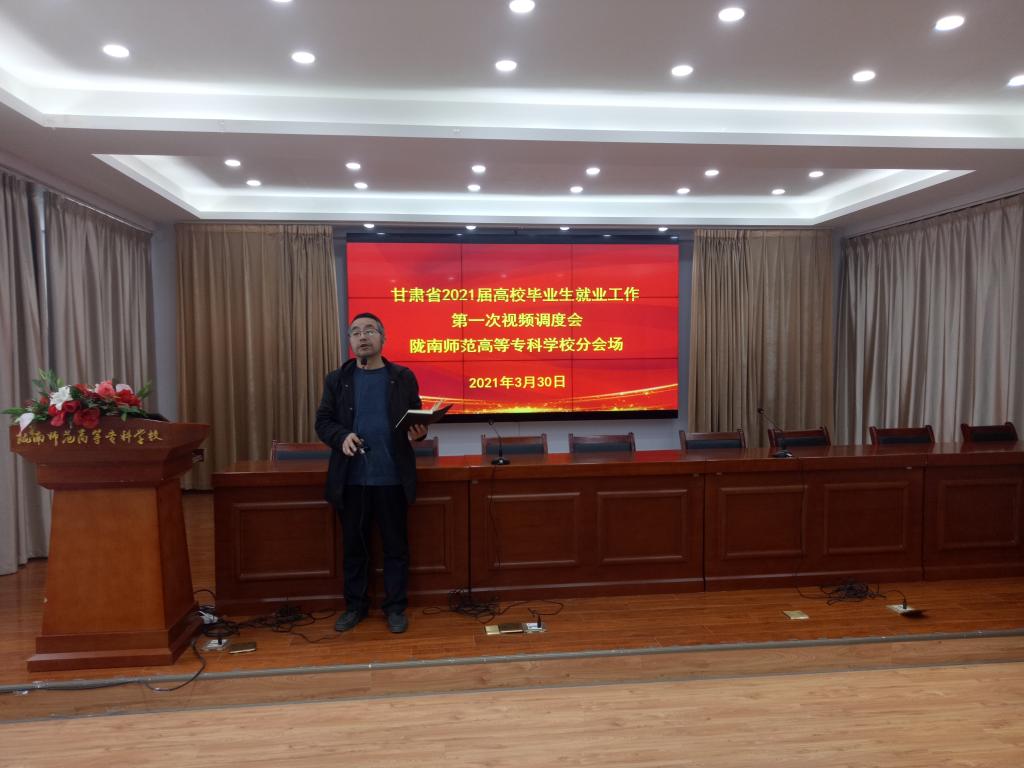 为深入贯彻党中央、国务院“稳就业”“保就业”决策部署,落实2021年全国两会精神和省委省政府关于做好高校毕业生就业工作的要求,分析全省高校毕业生就业工作形势,部署和推进高校毕业生就业工作,3月30日,省教育厅组织召开2021届全省高校毕业生就业工作第一次调度视频会议。省教育厅副厅长张国珍主持会议并讲话。我校分管副校长王胜青、招生就业处全体人员、院系就业工作人员、全体毕业班辅导员和班主任,在北校区电子商务学院三楼报告厅陇南师专分会场参加了会议。