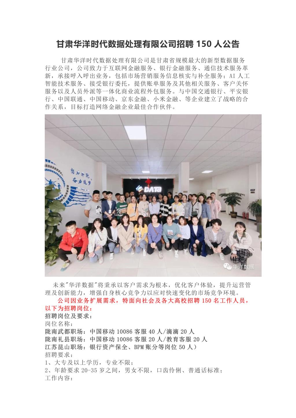 甘肃华洋时代数据处理有限公司招聘公告