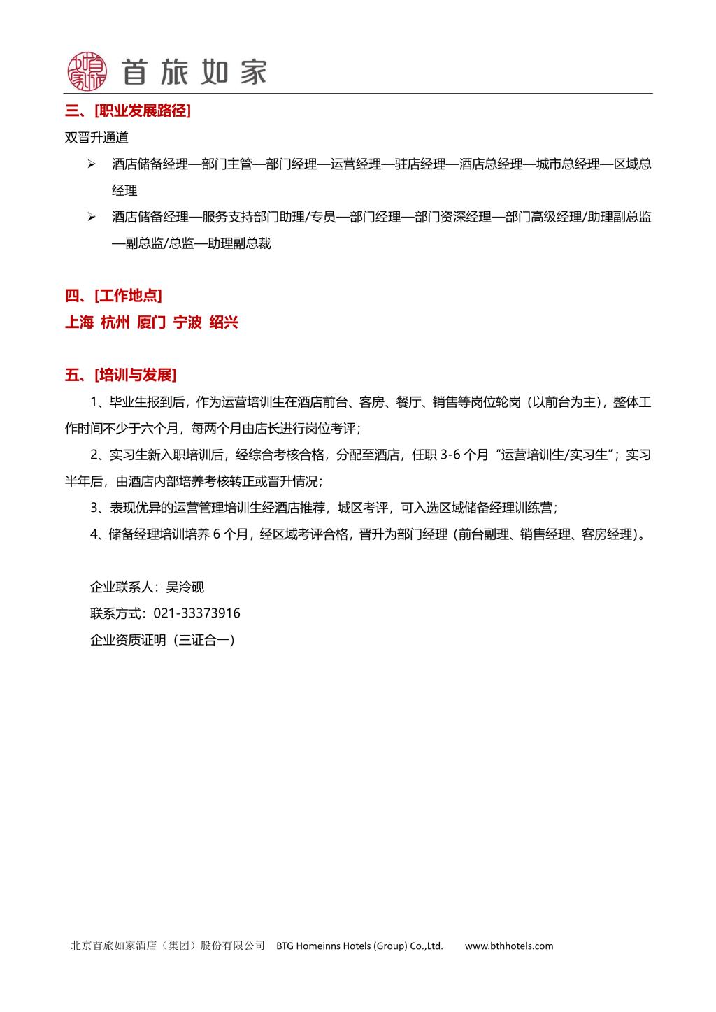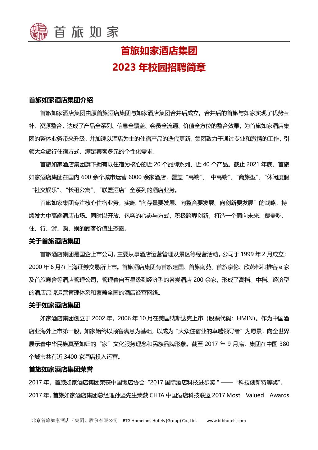 首旅如家酒店集团2023校园招聘简章