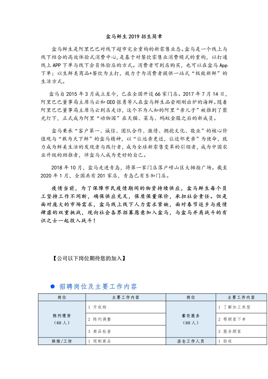 青岛盒马鲜生2020招聘简章
