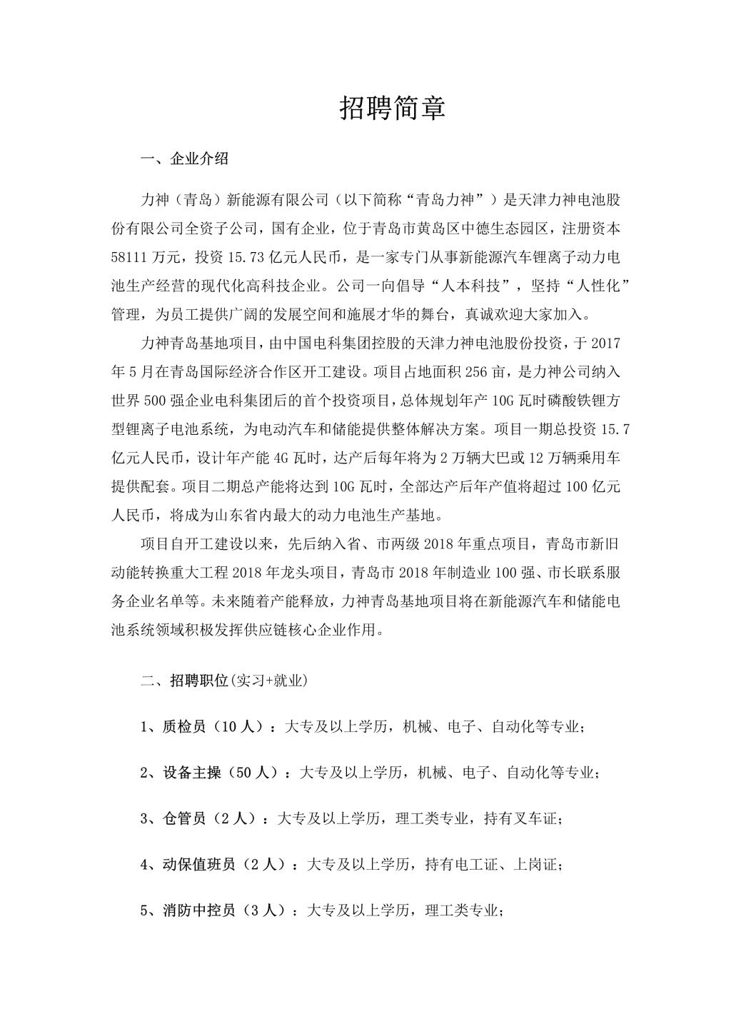 力神(青岛)新能源招聘简章