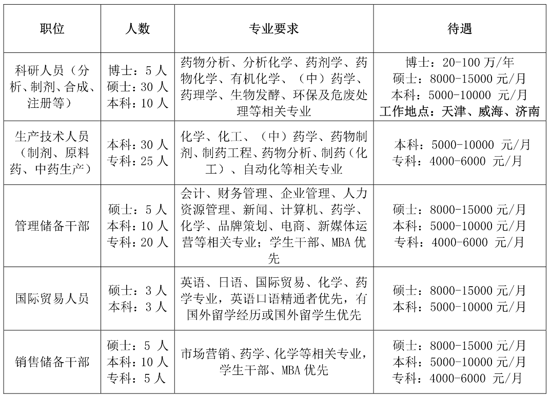 招聘制剂生产工艺和质量管理人才,同时面向全国招募医院和商业公司渠道代理商。