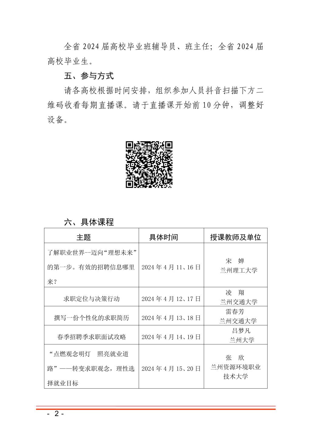 自4月11日-20日,每晚19:00-20:30在抖音直播间免费提供就业直播课程。请各学院根据课程安排,认真组织2024届毕业班辅导员、班主任,2024届毕业生收听收看,助力学生积极就业。