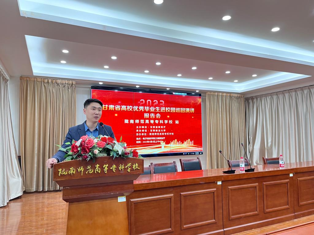 5月2日上午,学校在北校区电子商务学院报告厅举行2023年甘肃省高校优秀毕业生进校园巡讲陇南师专站首场报告会。本场报告会由甘肃农业大学2019届硕士毕业生、金徽酒股份有限公司董事长行政助理、兰州大区副总经理李文瑞,做题为“突破、转变、向前一步走”的优秀毕业生事迹报告。报告会由招生就业处处长汪鸿主持。我校300余名各年级学生现场聆听报告。