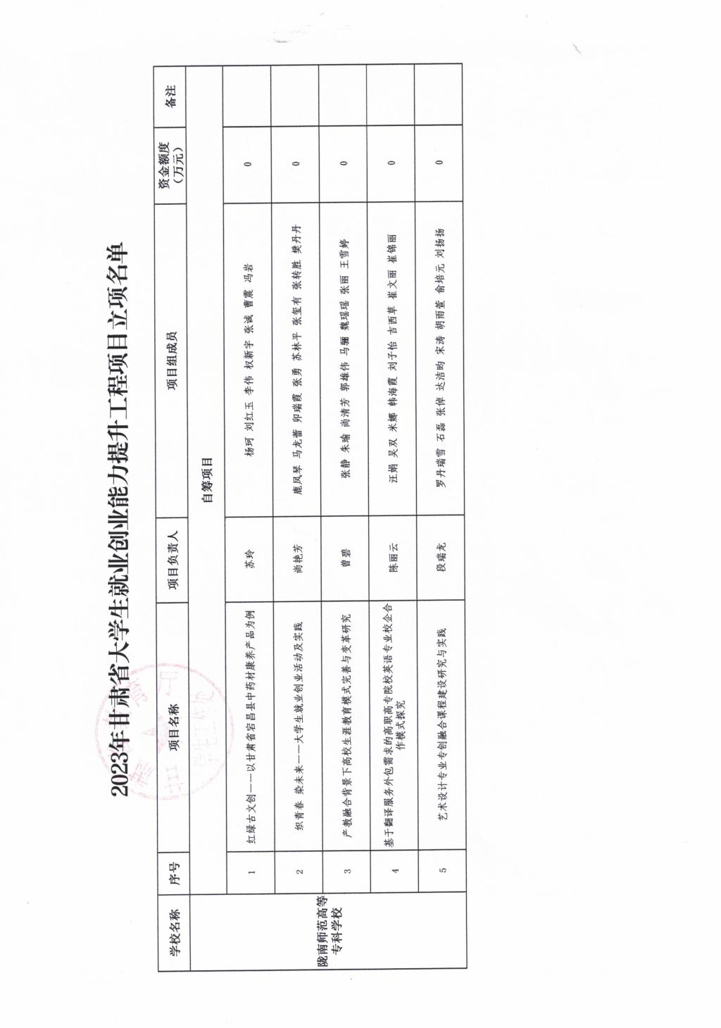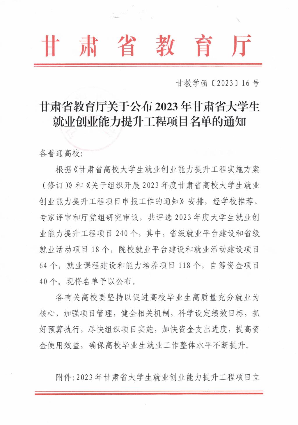 甘肃省教育厅关于公布2023年就业创业能力提升工程项目立项名单的通知