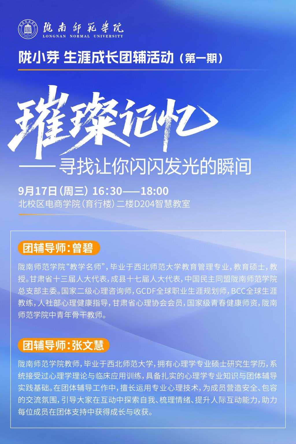 本次活动主题为“璀璨记忆:寻找让你闪闪发光的瞬间”。活动由学前教育学院教授曾碧、初等教育学院教师张文慧两位导师主持,通过情景模拟和分享讨论,引导学生挖掘个人优势,增强职业规划意识。