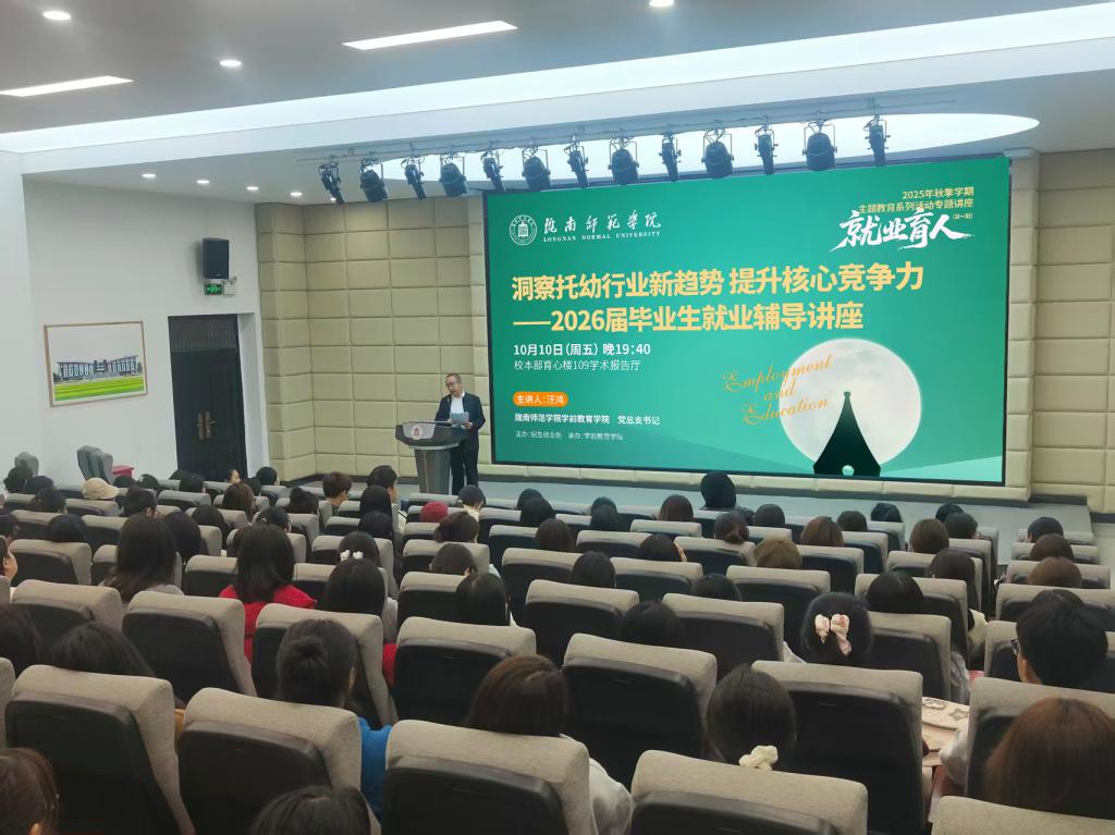 为深入贯彻落实学校“就业育人”工作理念,精准赋能学子职业发展,10月10日晚,招生就业处特邀学前教育学院党总支书记汪鸿在育心楼109学术报告厅,为我校2026届毕业生作了题为《洞察托幼行业新趋势,提升核心竞争力》的专题就业指导讲座。