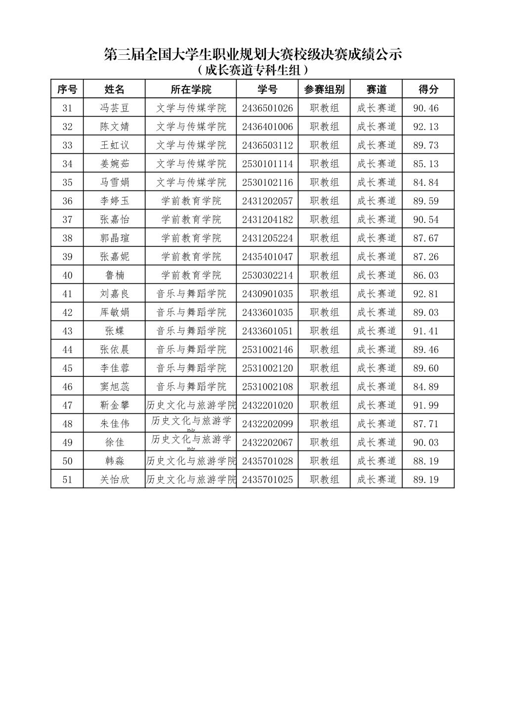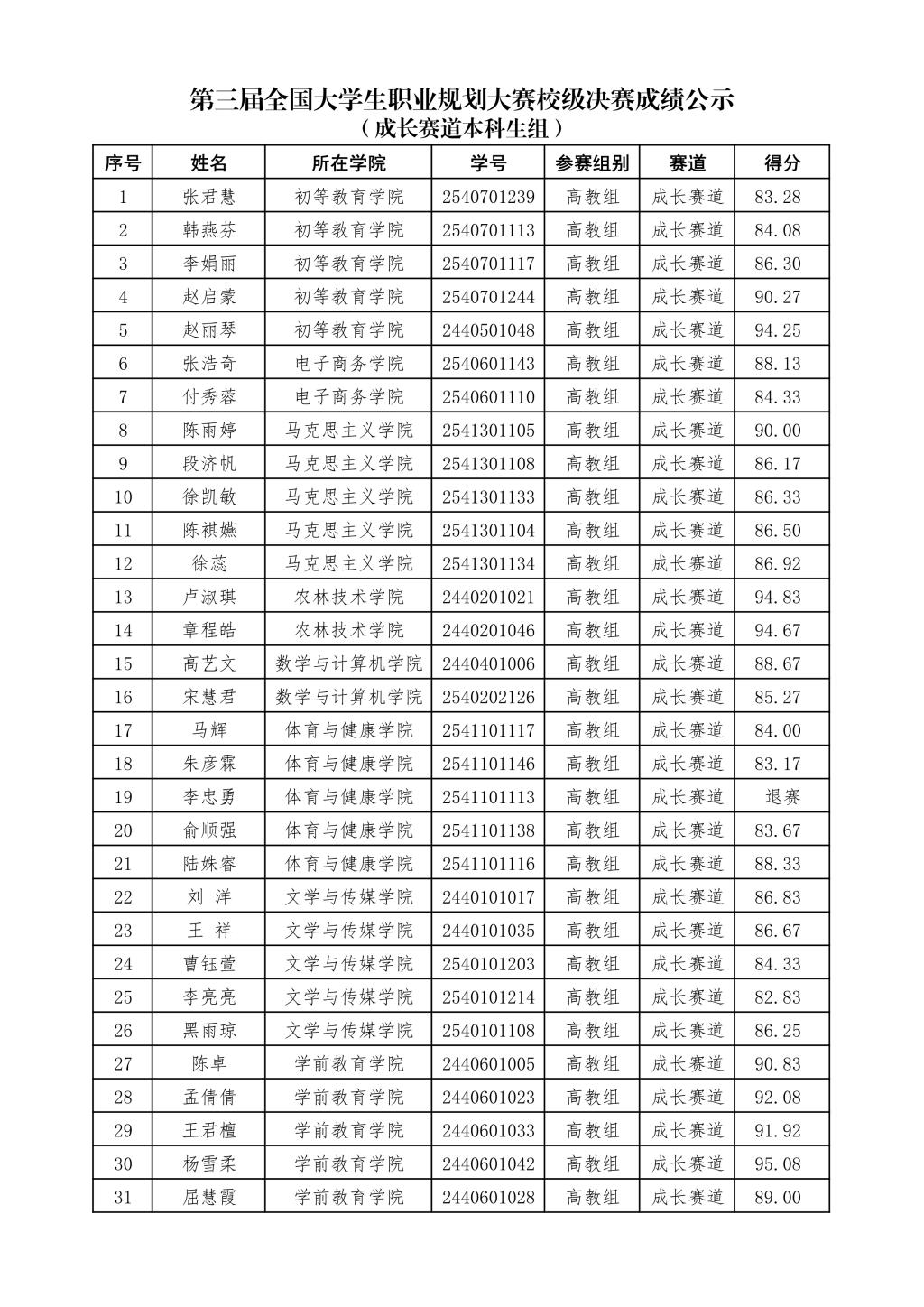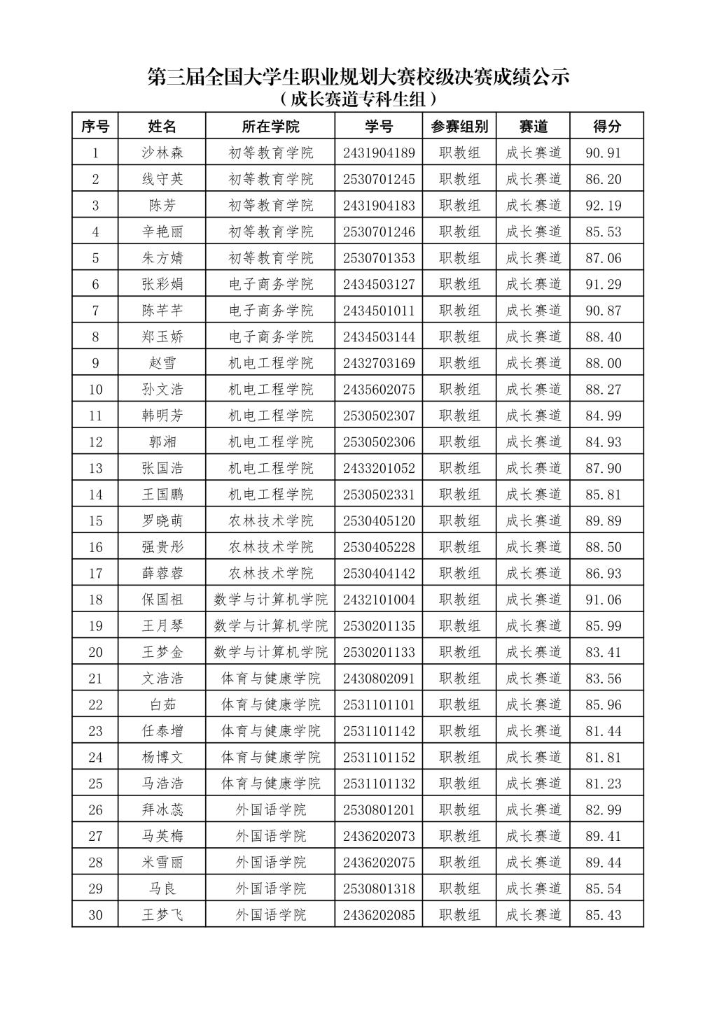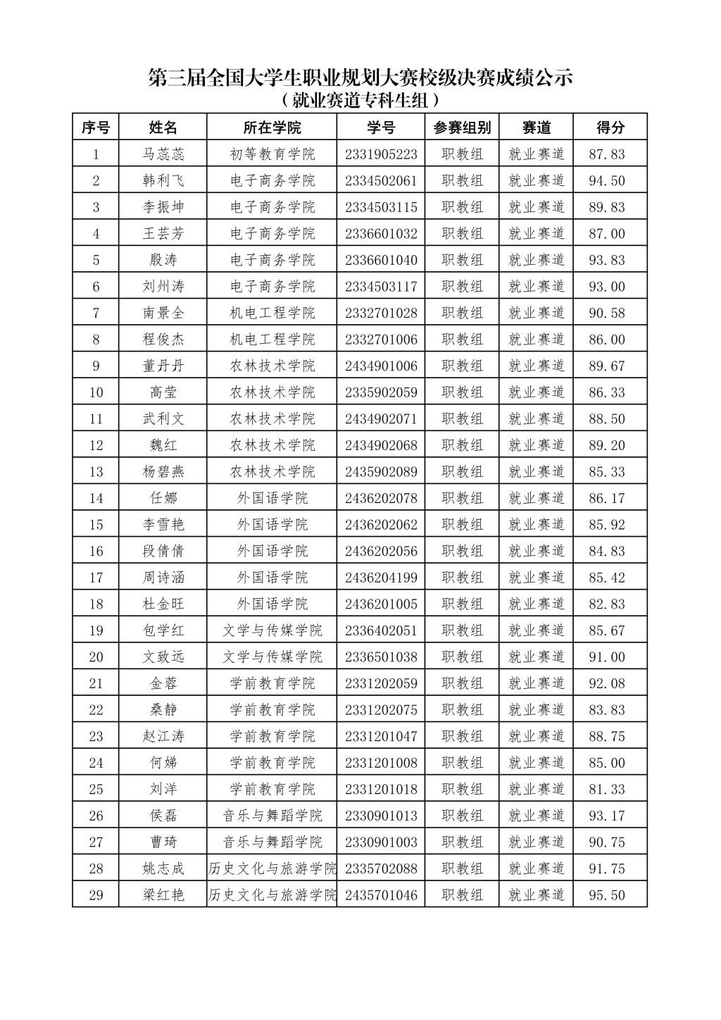 为增强大学生职业规划意识,指导其及早做好就业准备,以择业新观念打开就业新天地,我校成功举办第三届全国大学生职业规划大赛校赛。经选手展示、评委评审,现将选手成绩公示如下,公示期自即日起三个工作日。如有异议,请以书面形式(需注明姓名、院系、联系方式)向学校招生就业处(学术中心209)反馈,逾期不再受理。