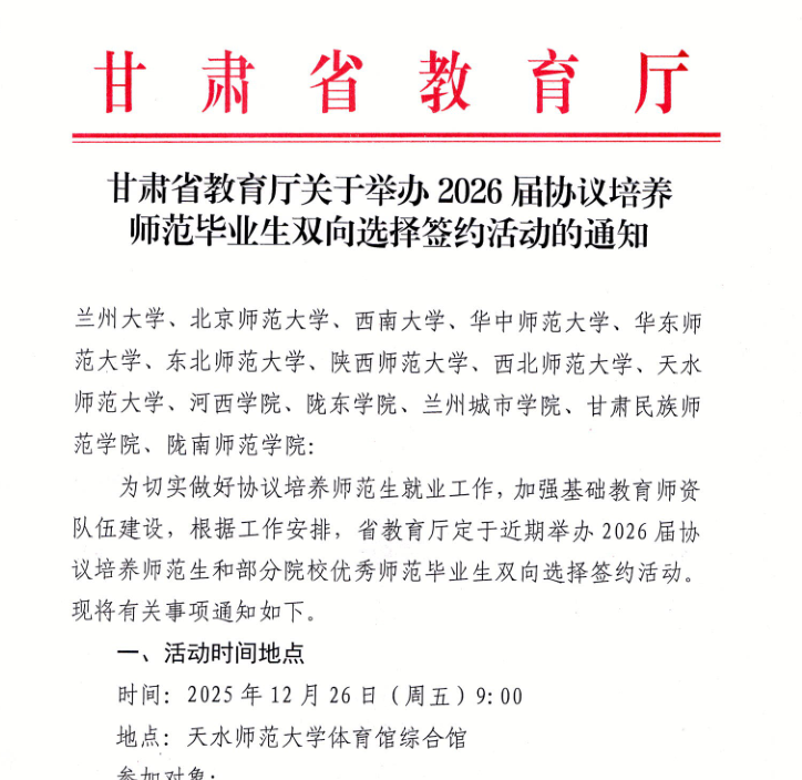 12月26日,甘肃省教育厅在天水师范大学体育馆举办2026届协议培养师范毕业生双向选择签约活动。招生就业处、初等教育学院积极组织小学教育全科专业协议培养毕业生参加此次活动,助力学生对接就业岗位、拓宽就业渠道。